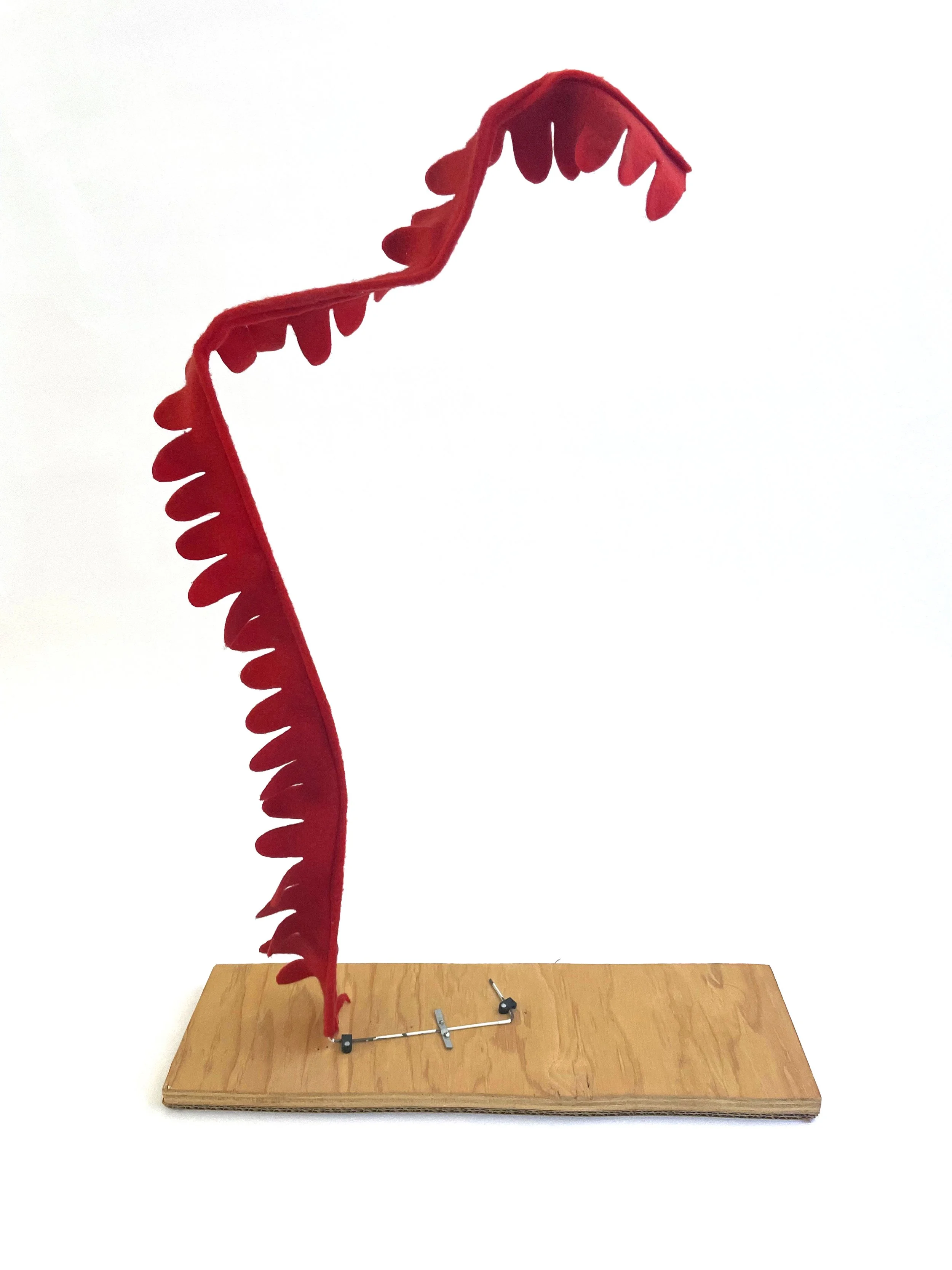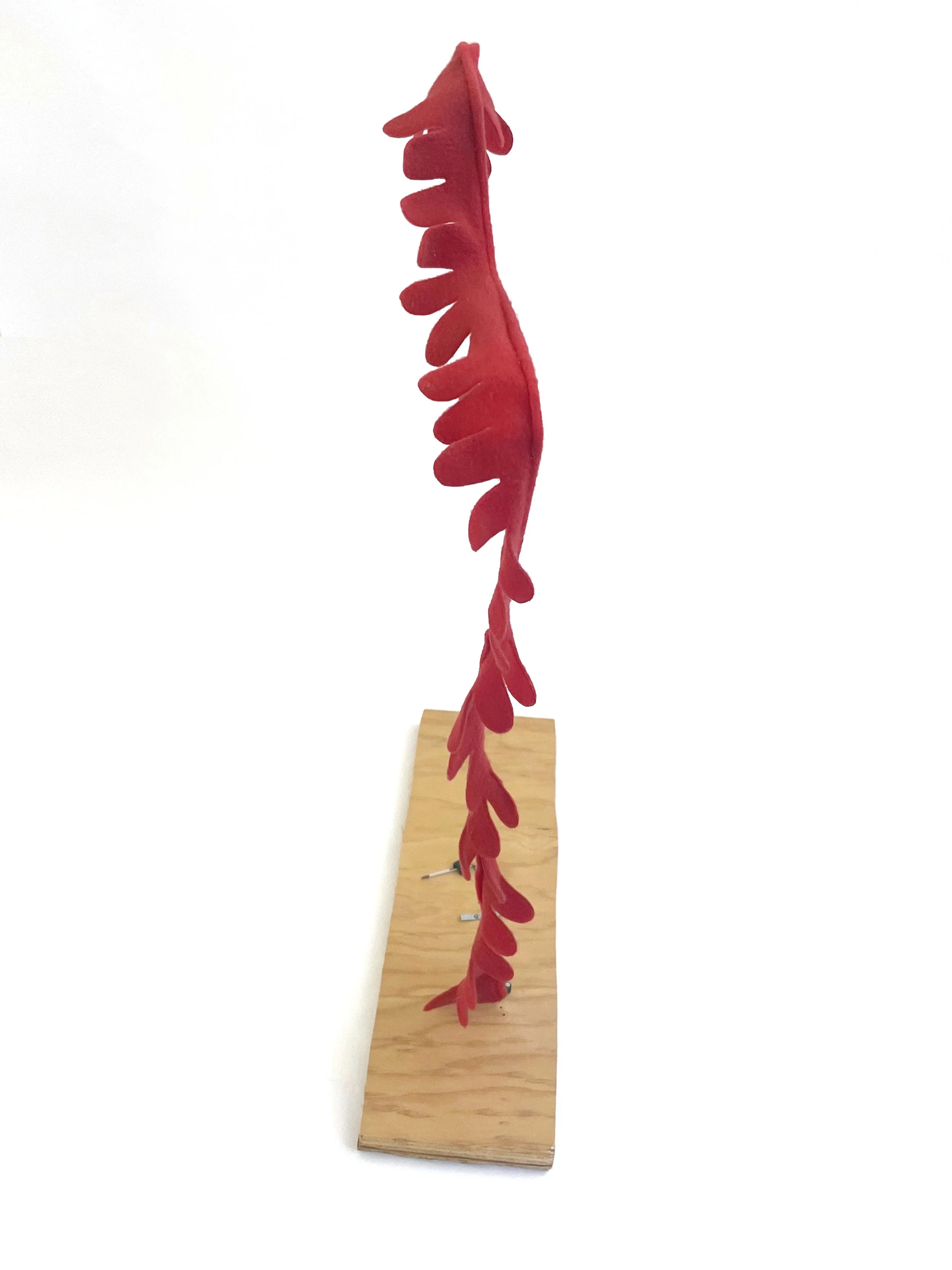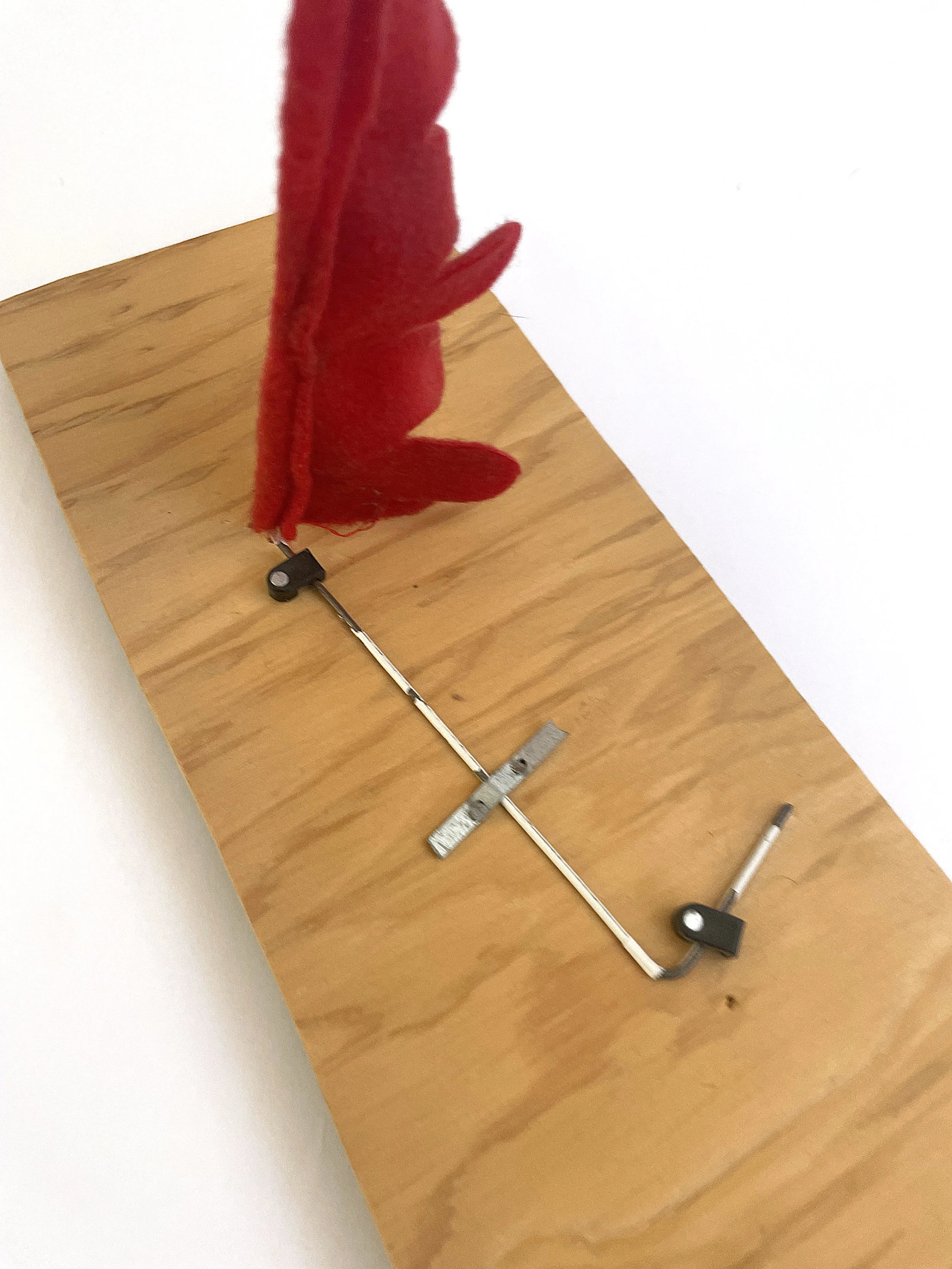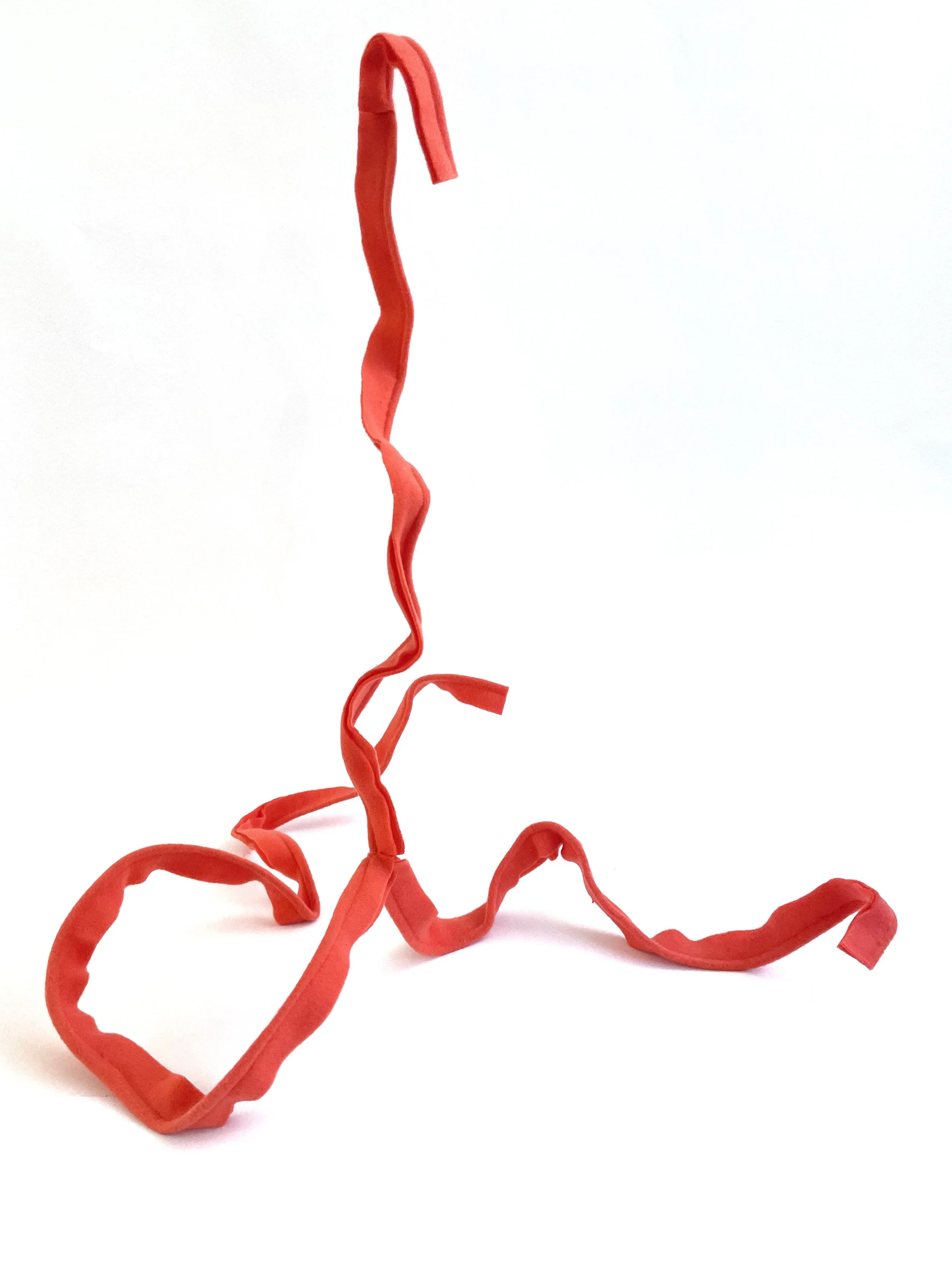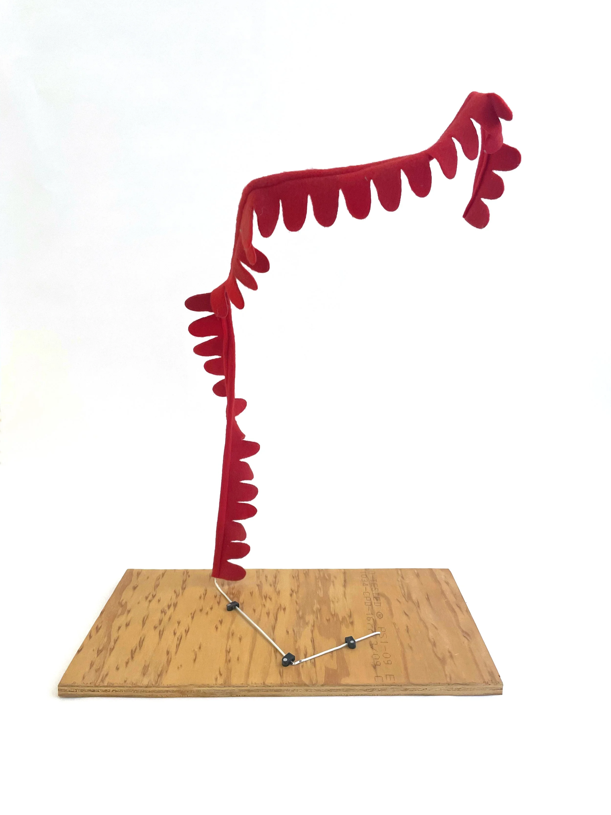 Red Ikea synthetic fabric throws, wire hangers, found plywood, fasteners.