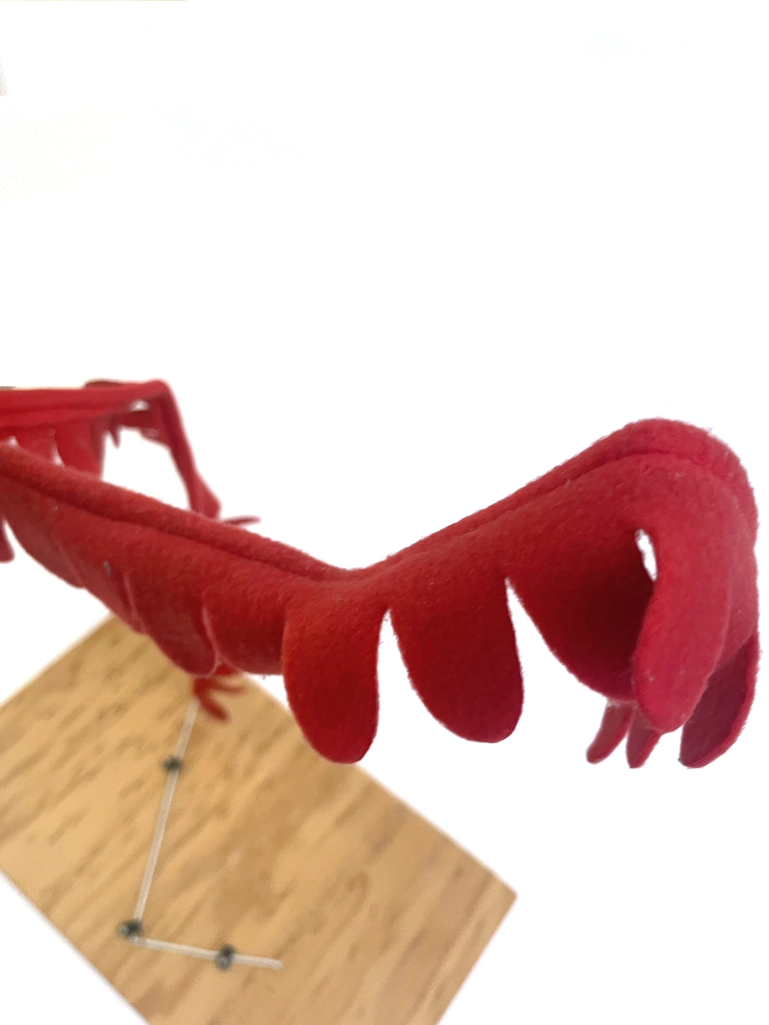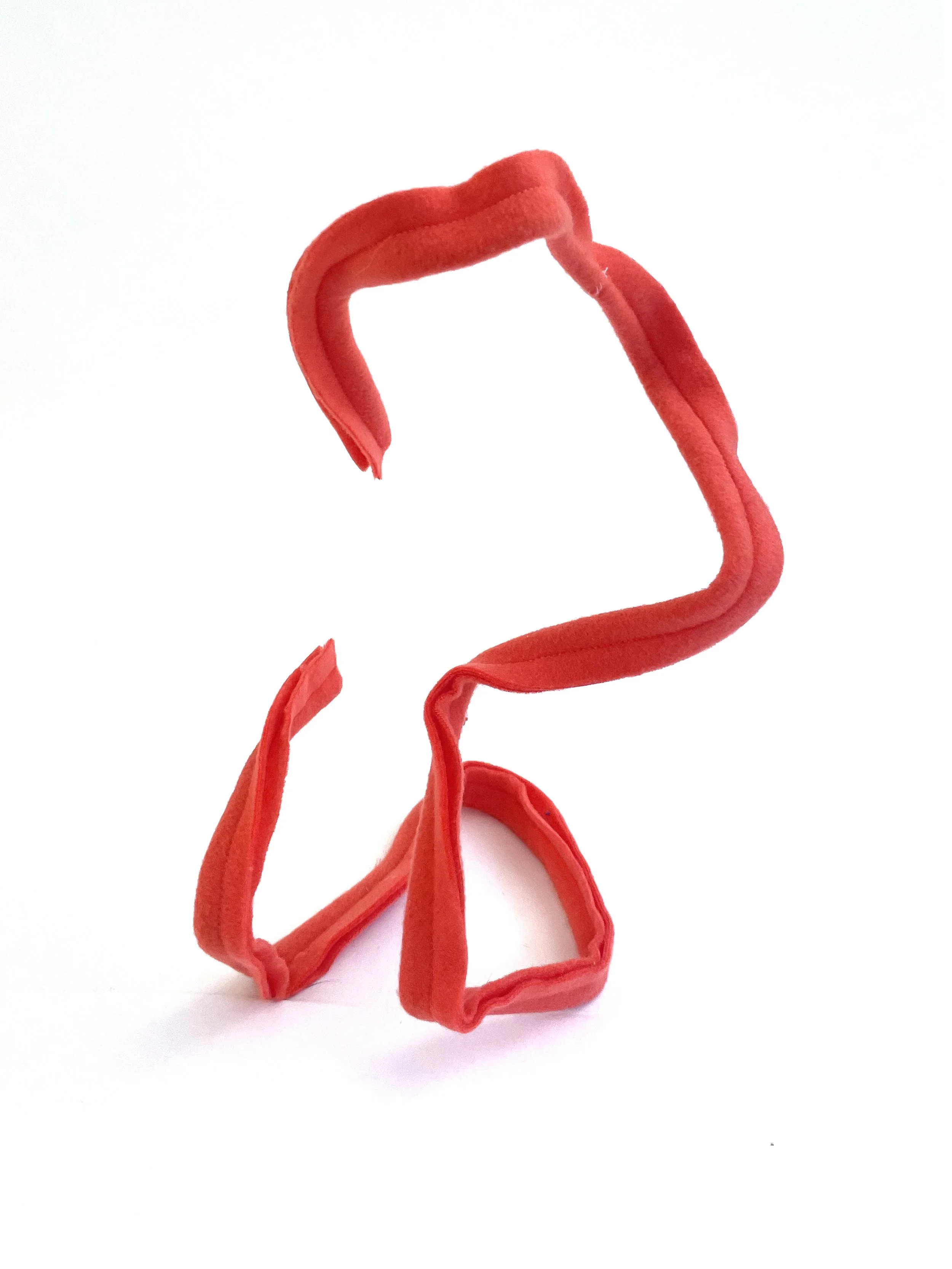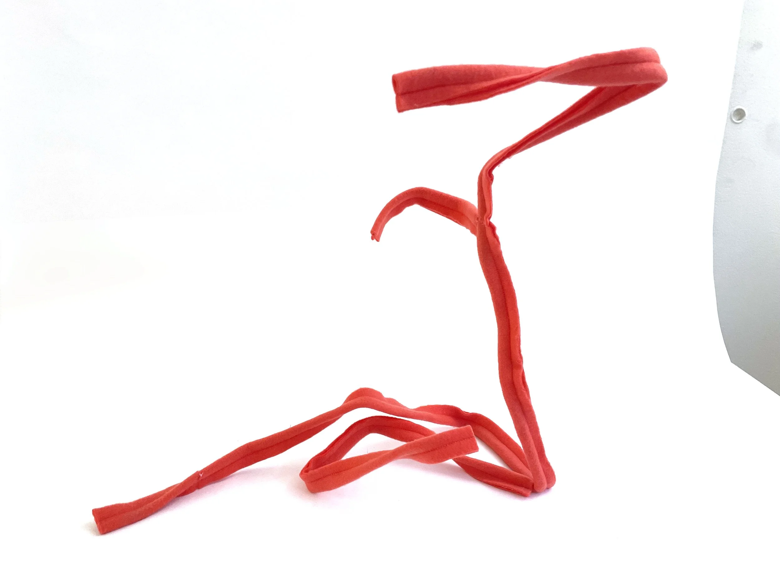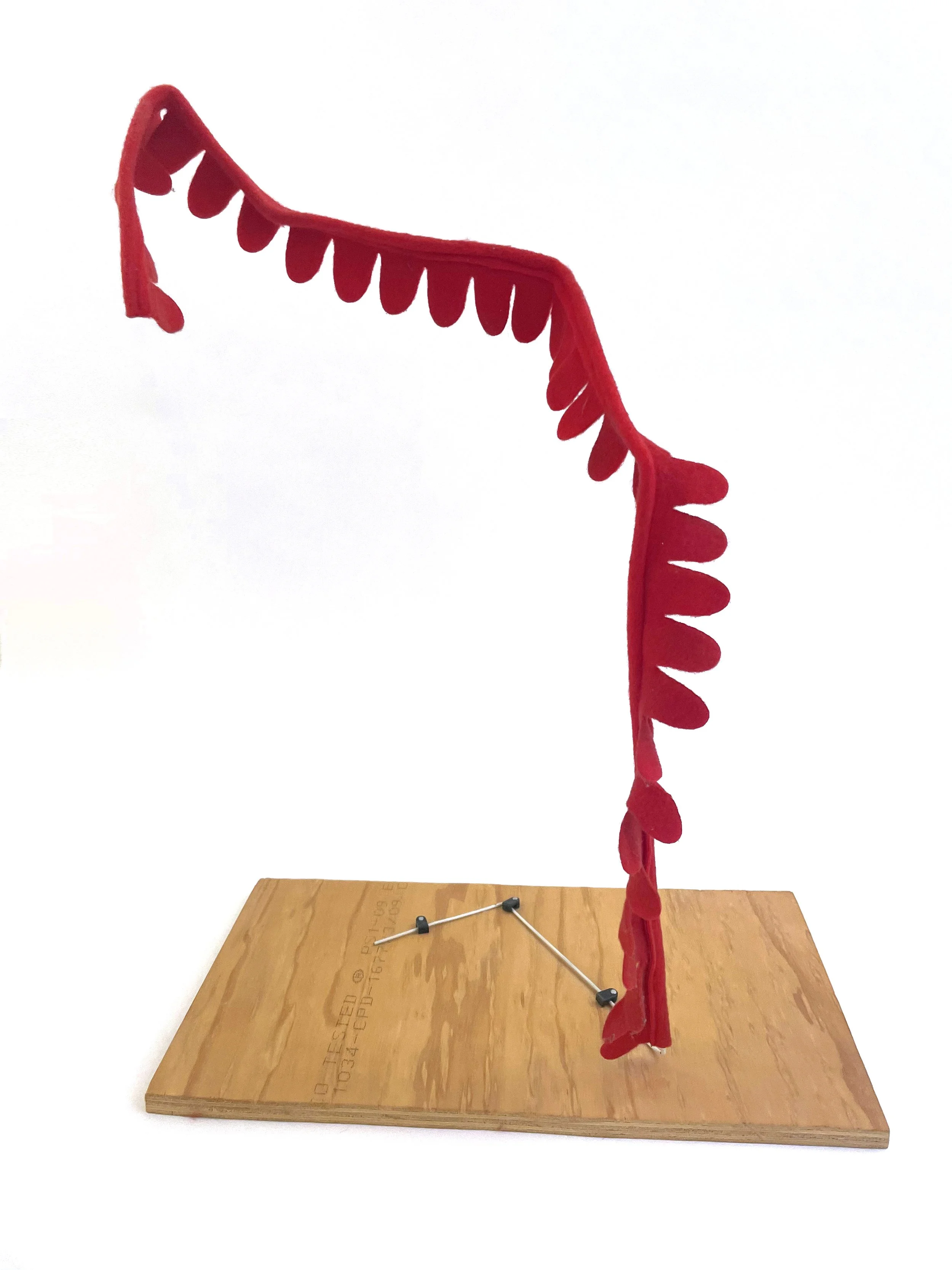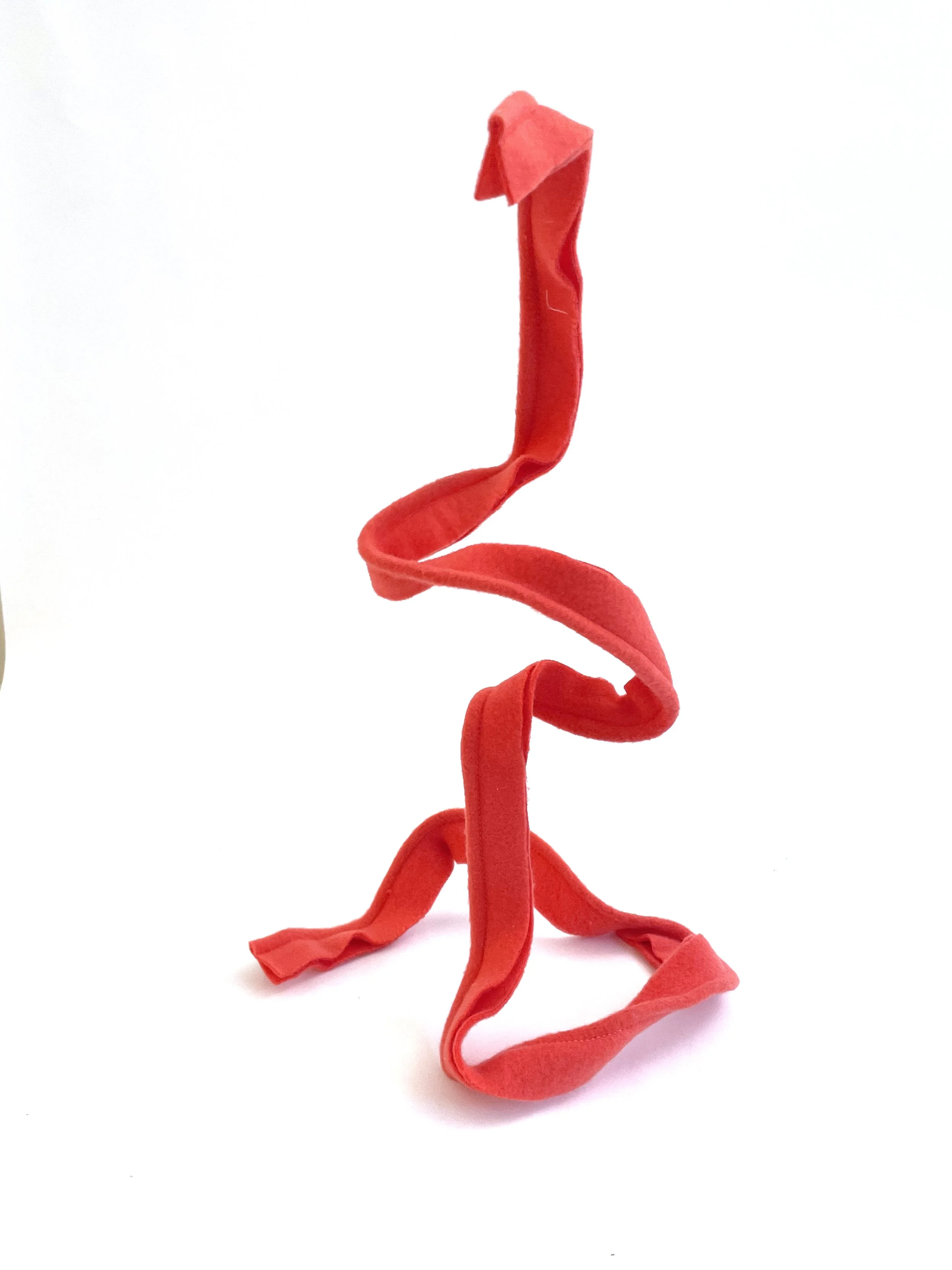 Red Ikea synthetic fabric throws, wire hangers, found plywood, fasteners.
