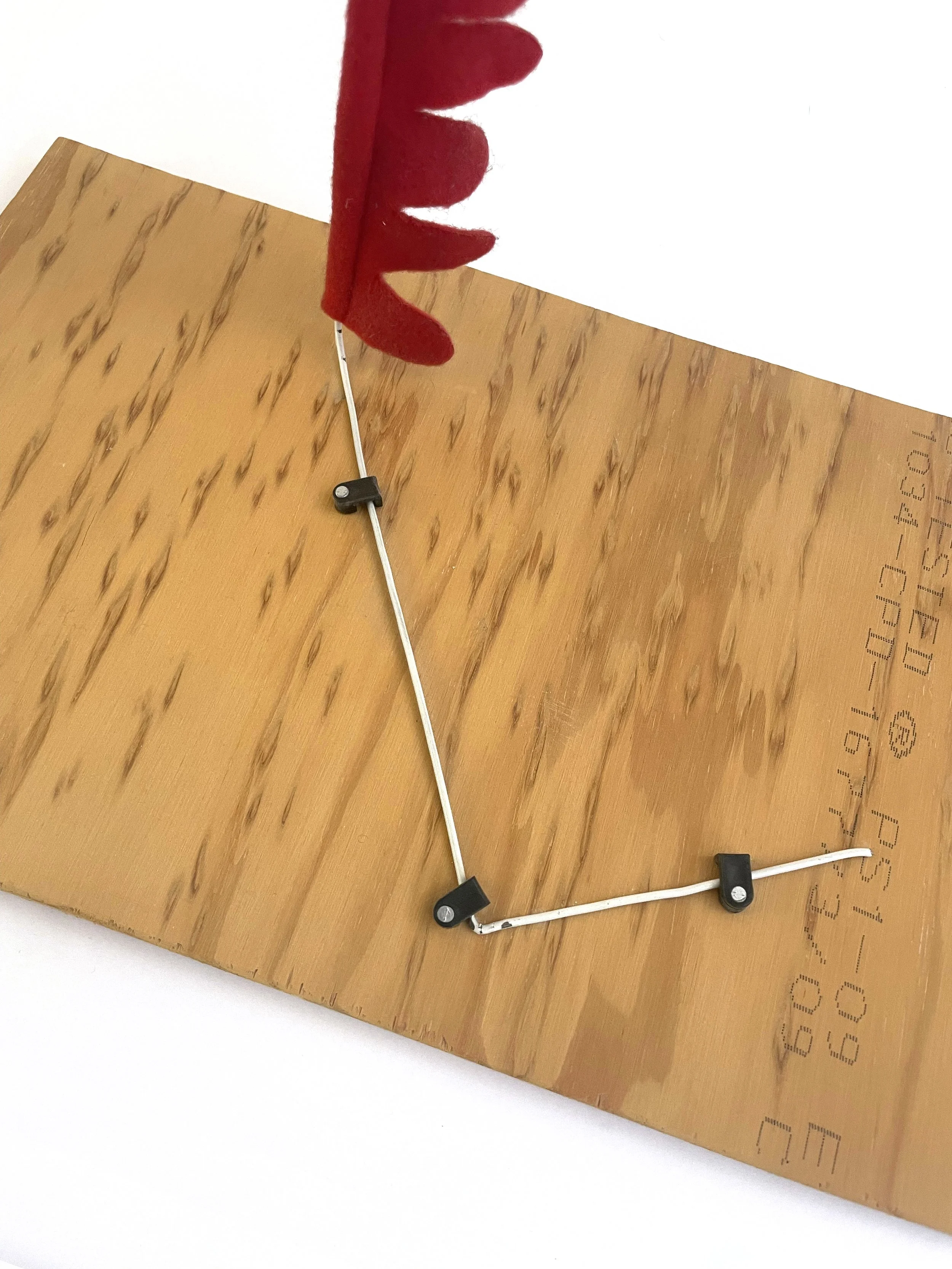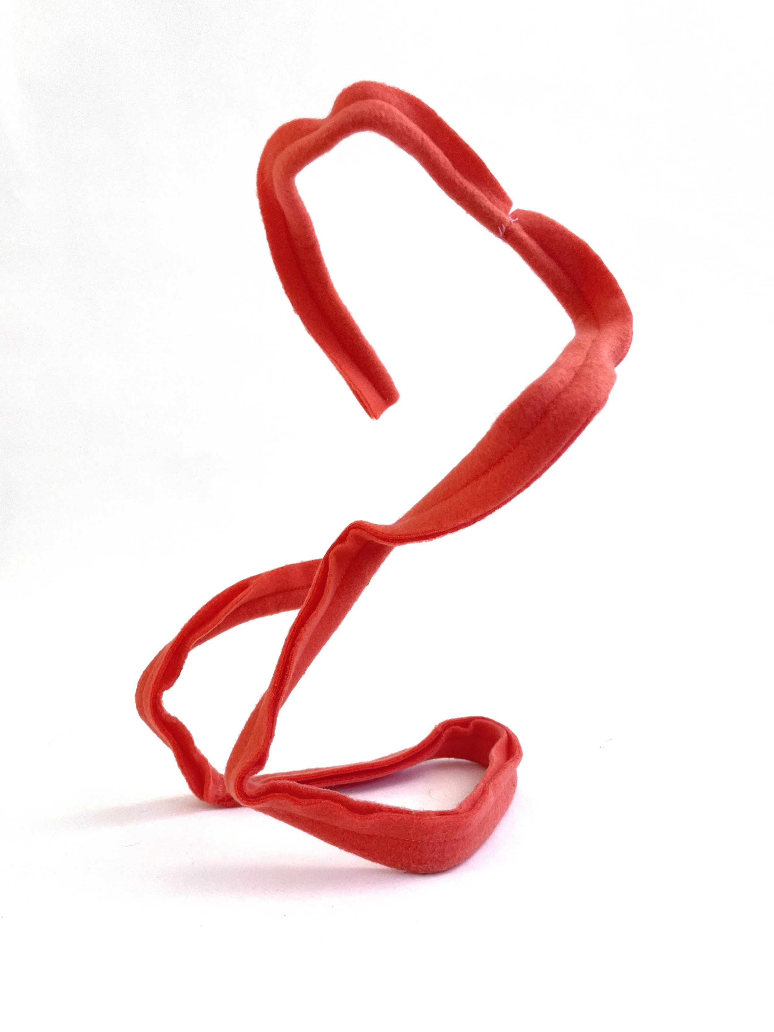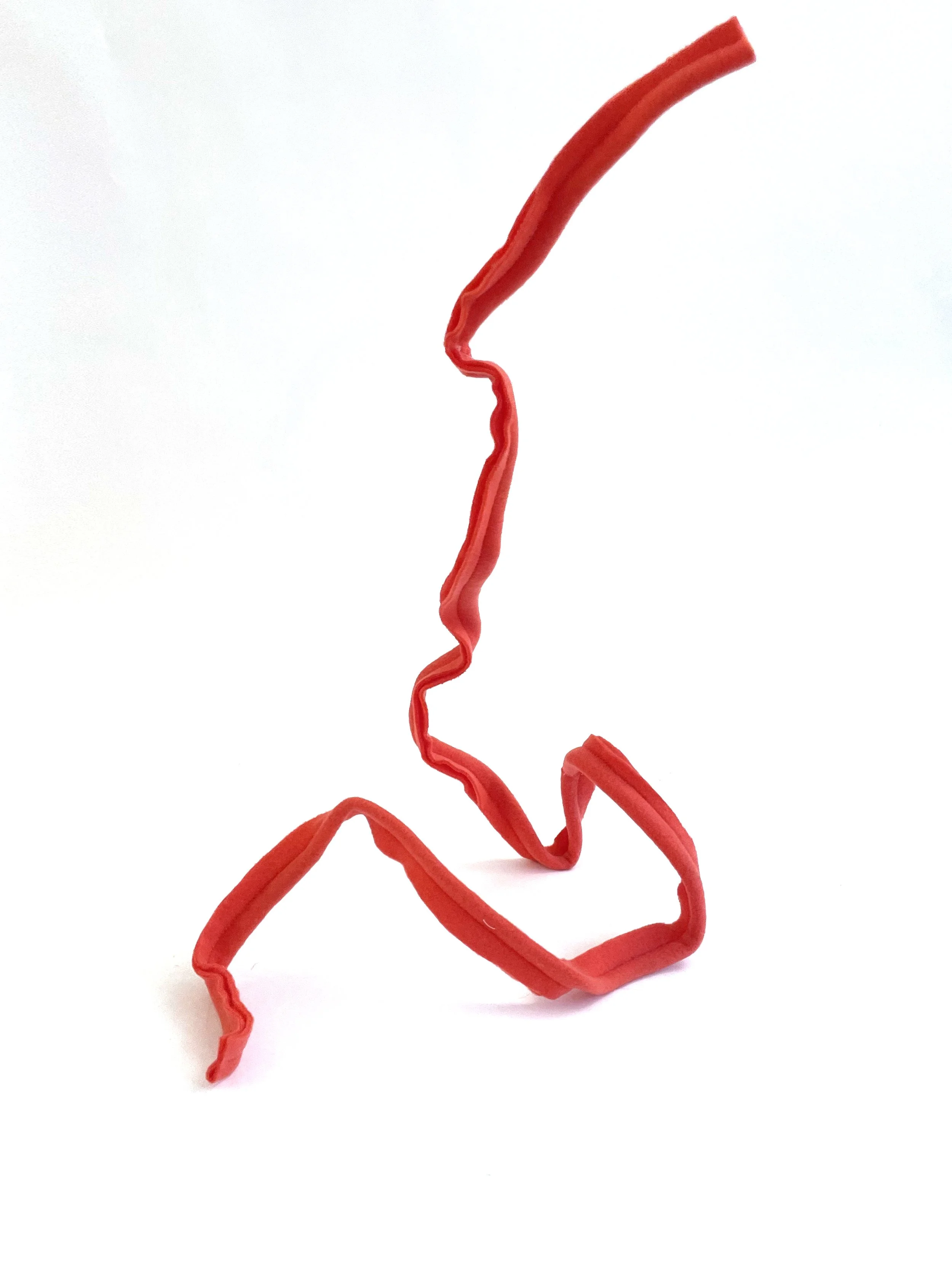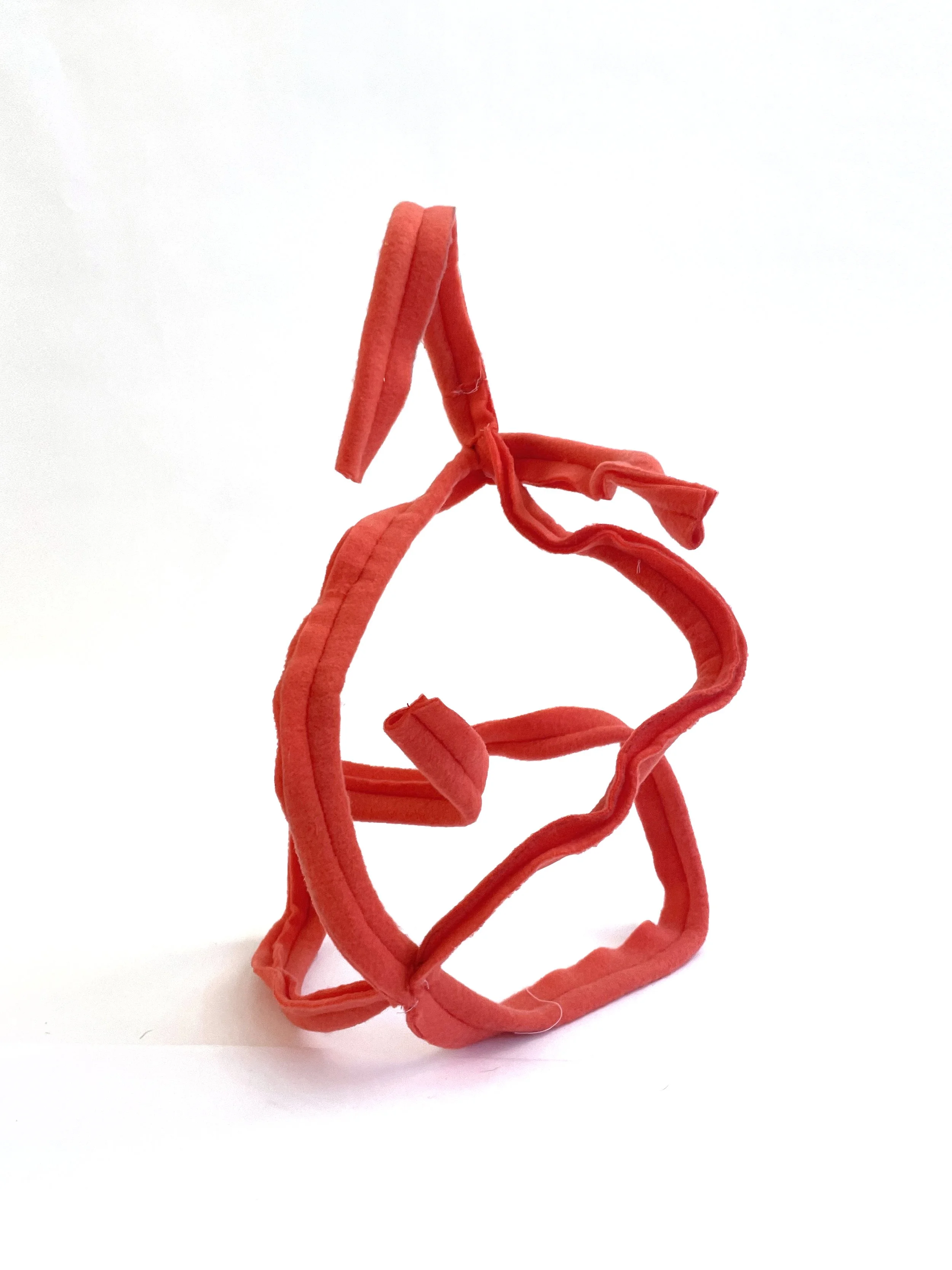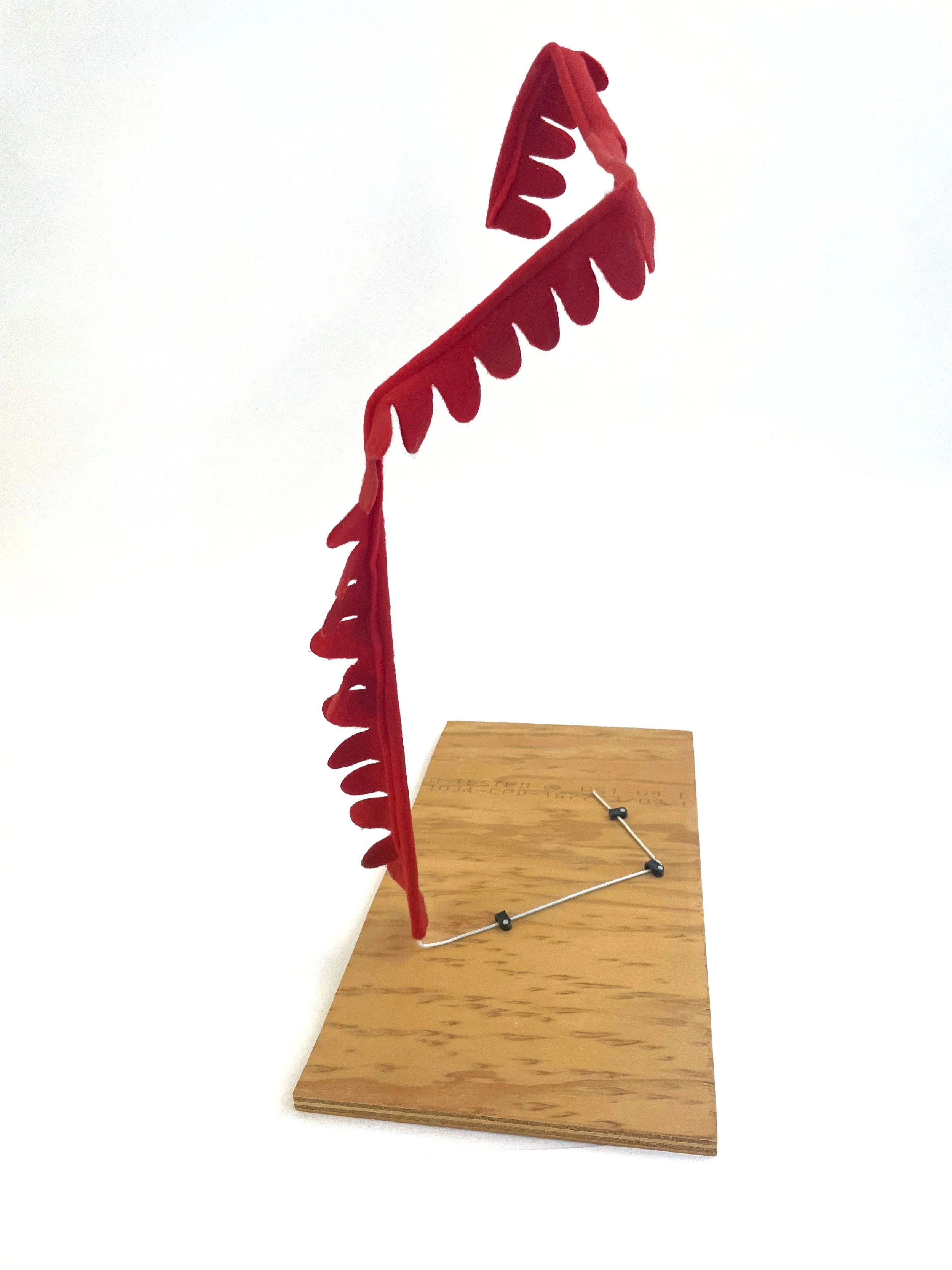 Red Ikea synthetic fabric throws, wire hangers, found plywood, fasteners.